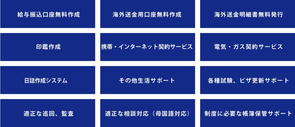 住居の準備はもちろん、家具家電の手配、通信インフラ整備、日本語学習支援、病院への同行など、